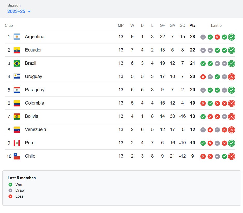 輸波嘅哥倫比亞遭遇三連敗,過去5場波輸咗4場,積分停喺19分,排名直線下跌到第6名,只係領先第7名6分。巴拉圭憑住阿爾德雷特嘅入球1-0小勝智利,戰績提升到5勝5和3負,積20分暫列第4名。輸波嘅智利無緣連勝,遭遇第8場敗仗,積分仲係得9分,排名墊底,以佢哋嘅實力同狀態,如果唔可以盡快反彈,連附加賽都攞唔到,只會提早出局。